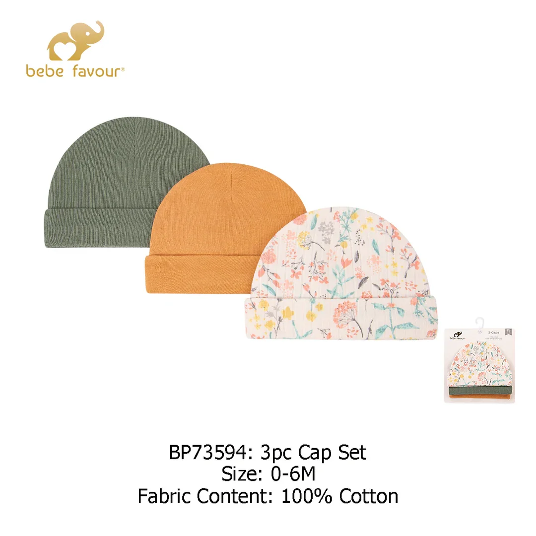 Includes a set of three caps in coordinating solid colors and prints