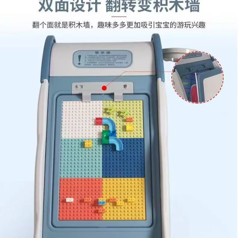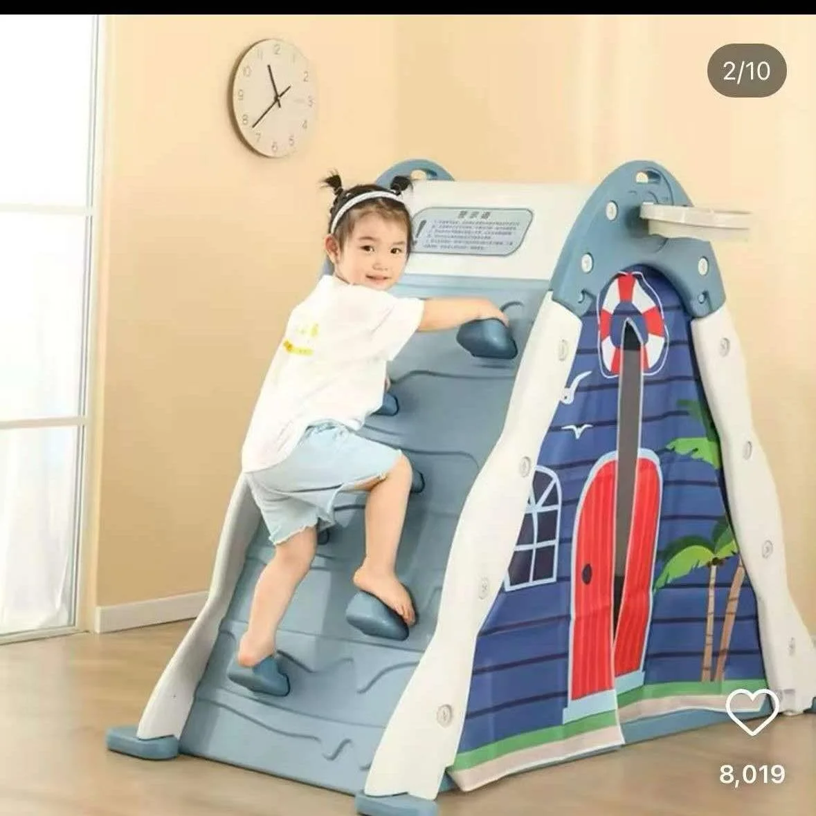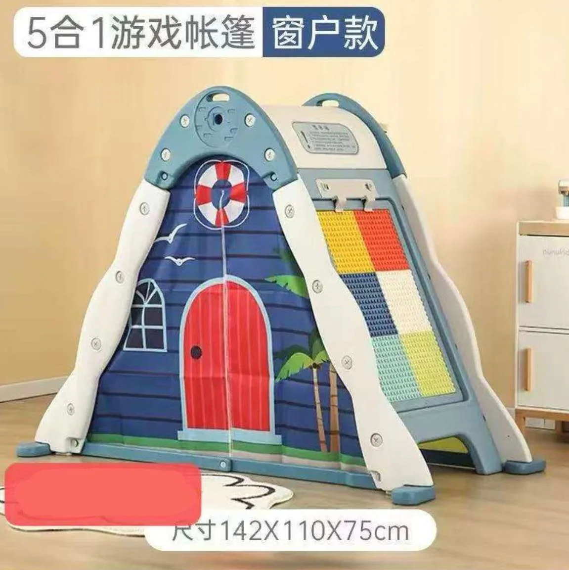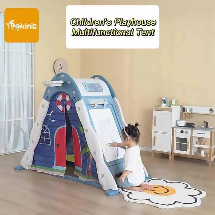 Features: Climbing Slide, Drawing Board, Basket Hoop, Lego Board, Tent House